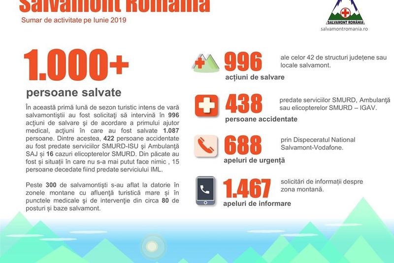 Asociaţia Naţională a Salvatorilor Montani din România (A.N.S.M.R.) şi Consiliul Serviciilor Publice Salvamont au centralizat activitatea, pe luna iunie a anului 2019, a celor 42 de structuri judeţene sau locale salvamont din cele 24 de judeţe cu activitate de salvare montană din România. Bilanțul este îngrijorător-15 persoane decedate. Salvamont România a lansat campania "Vara 2019- vara responsabilității pe munte’’