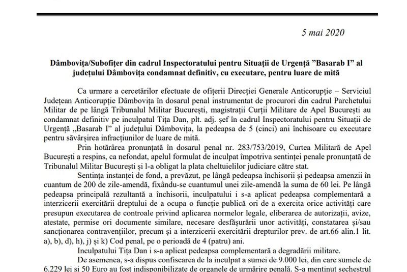 "Ca urmare a cercetărilor efectuate de ofițerii Direcției Generale Anticorupție – Serviciul Județean Anticorupție Dâmbovița în dosarul penal instrumentat de procurori din cadrul Parchetului Militar de pe lângă Tribunalul Militar București, magistrații Curții Militare de Apel București au condamnat definitiv pe inculpatul Tița Dan, plt. adj. șef în cadrul Inspectoratului pentru Situații de Urgență „Basarab I” al județului Dâmbovița, la pedeapsa de 5 (cinci) ani închisoare cu executare pentru săvârșirea infracțiunilor de luare de mită.