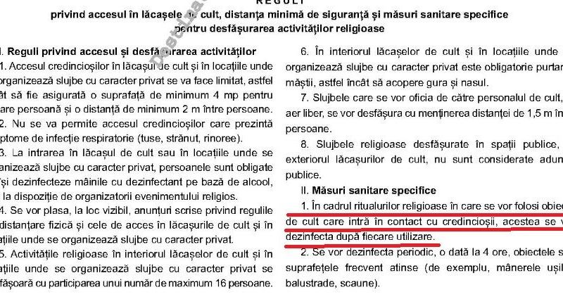 ,,În cadrul ritualurilor religioase în care se vor folosi obiecte de cult care intră în contact cu credincioșii, acestea se vor dezinfecta după fiecare utilizare. Se vor dezinfecta periodic, odata la 4 ore, obiectele sau suprafee frecvent atinse," se spune în ordinul comun al Ministerul Sănătății și Ministerului de Interne privind normele sanitare în lăcașurile de cult.
