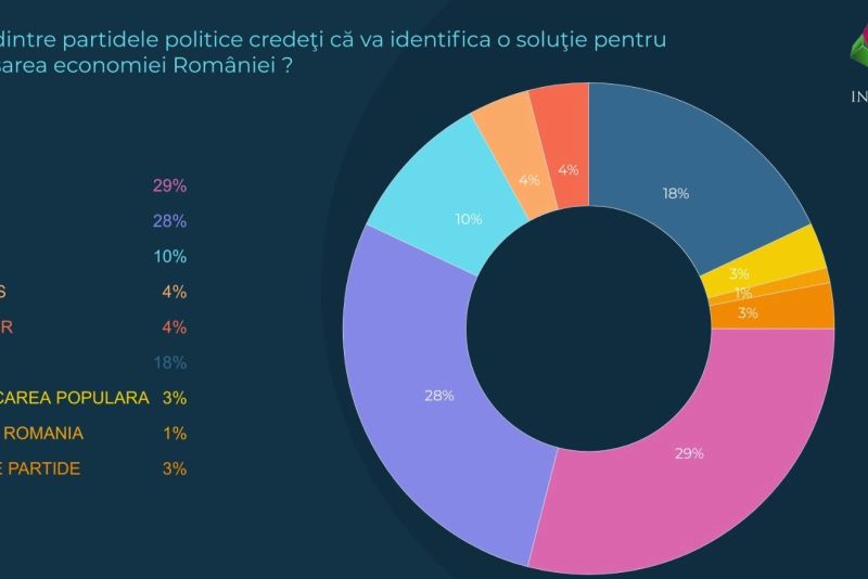 Pe de altă parte, la întrebarea "Care dintre partidele politice credeți că va identifica o soluție pentru relansarea economiei României?", PNL se află pe primul loc, cu 29% din voturi. Urmează PSD, cu 28%, și AUR, cu 18%. Deloc surprinzător, pe ultima poziție se clasează tot partidul PRO România, tot cu 1%.