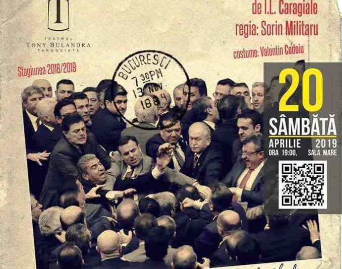 Sâmbătă 20 aprilie, de la ora 19:oo, în Sala Mare a Teatrului Tony Dulandra, are loc la super-producția „O scrisoare pierdută”, de I.L. Caragiale, în regia lui Sorin Militaru.Costumele sunt realizate de Valentin Codoiu, iar din distribuție fac parte Tipătescu – Dorin C Zachei | Zoe – Paula Chirila | Trahanache – Chiributa Paul | Cațavencu – Liviu Cheloiu | Pristanda – Sf Ilie Ghergu | Cetățeanul turmentat – Cristian Olaru | Farfuridi – Farcas Bogdan | Brânzovenescu – Emanuel Bighe | Dandanache – Mircea Silaghi și Alegătorii: Stefan Stefanescu, Radu Marin Ilicea, Matei Corbu, Gheorghe Dima, Macarie Ioan Mircea, Florin Georgescu, Alexandru Sandu, Necşoiu Florin.„Titlul O scrisoare pierdută spune totul: intrigi politice și amoroase, degringolade personale și colective, personaje savuroase de-a dreptul în interpretări de excepție… Dulcele stil caragialesc. Cum ați putea rata un asemenea spectacol?!”, se precizează pe pagina de Facebook a Teatrului.Bilete online: