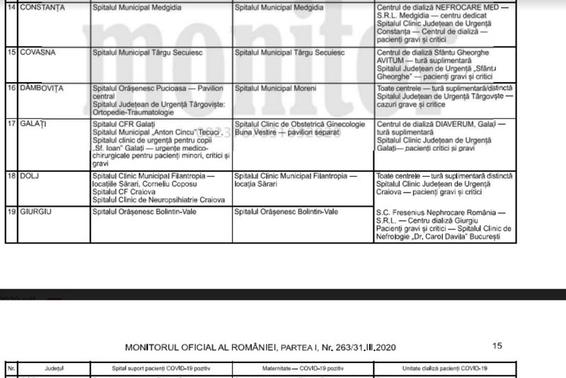 Lista spitalelor suport, pentru fiecare județ, a fost publicată în Monitorul Oficial
