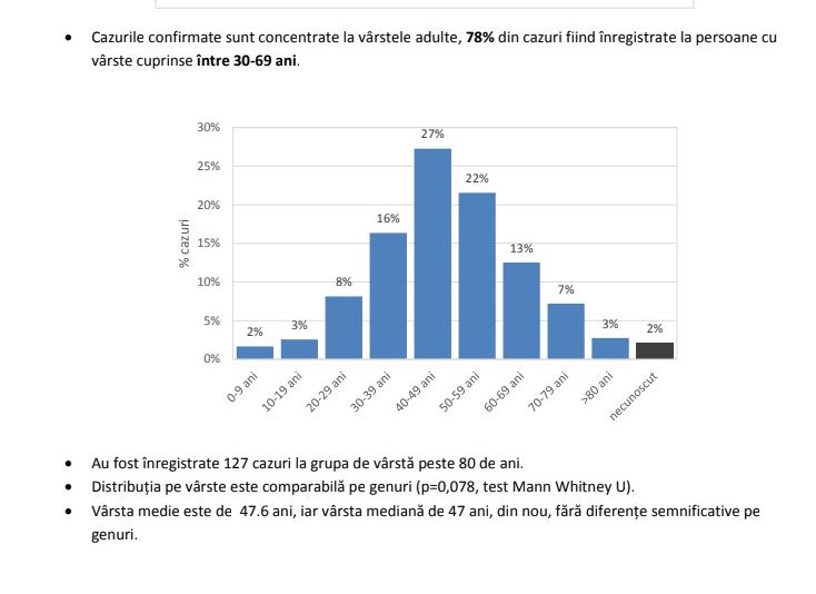 Cazurile confirmate sunt concentrate pe vârstele adulte, 78% din cazuri fiind concentrate la persoane cu vârste cuprinse între 30-69 de ani.