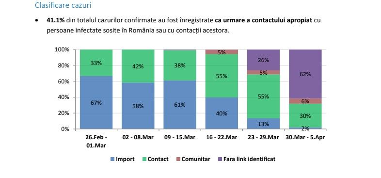 Din totalul de cazuri confirmate, 4051 (până la data de 5 aprilie) doar 471 de cazuri au fost la persoane care au revenit în România din străinătate, ponderea cazurilor de import fiind 11,6% (până la data de 5 aprilie).