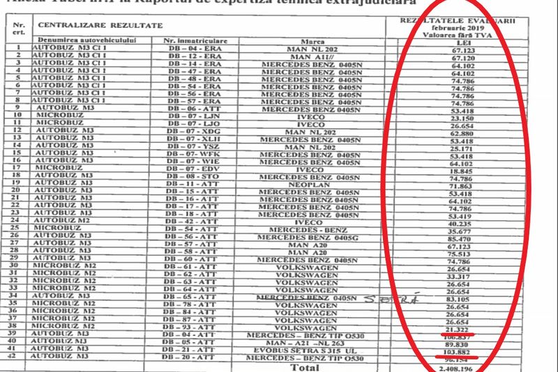 Valoarea tranzacției, conform unui proiect de hotărâre de consiliu local (Vezi foto), ce urmează a fi aprobat în data de 15 februarie, este de 1.465.375 de lei (fără TVA) pentru 38 de autobuze (dintr-un total de 42 evaluate). Valoarea fiecărei mașini a fost estimată la prețuri ce variază între 21.322 de lei și 106.837 de lei. Toate aceste mașini folosind combustibil motorina.
