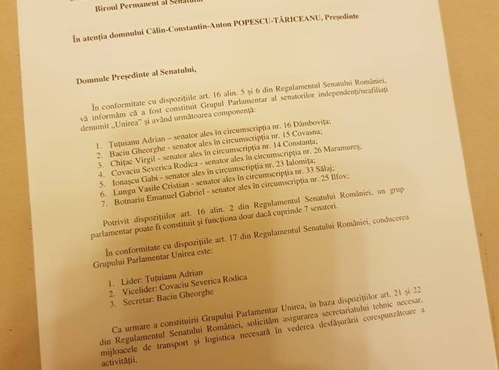 "Am depus astăzi, către Biroul Permanent al Senatului, o informare privind înființarea unui nou grup palamentar al senatorilor independenți/neafiliați - „UNIREA”. Am pornit de la regulamentul Senatului și de la decizii precedente ale Curții Constituționale și, după consultări cu parlamentarii care sunt în această situație, am inițiat acțiunea.