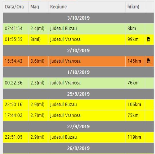 De la debutul lunii octombrie patru cutremure au fost înregistrate în zona seismică Vrancea.Față de cele amintite anterior au mai fost înregistrate: