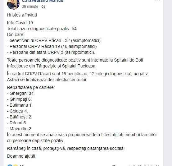 Primarul din Răcari a confirmat pe pagina personală de facebook decesul persoanei (83 de ani) de la SJUT, ce a fost adusă de la centrul medico-social din Răcari, confirmată cu coronavirus. Un alt deces din localitate este suspectat că ar fi fost provocat de coronavirus spune primarul Marius Caravețeanu, într-o postare de astăzi, 23 aprilie.