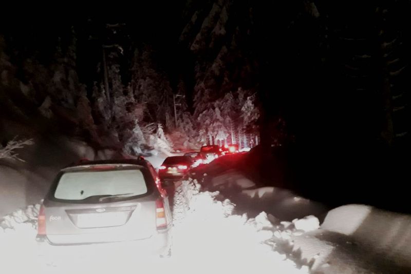 VIDEO 60 de turiști înzăpeziți în zona sanatoriului Moroeni, pe DJ 714 Moroeni-Peștera