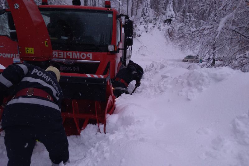 Un echipaj de la ISU Dâmbovița a fost solicitat să ajute la deblocarea DJ 714, drum ce a fost blocat de câțiva arbori căzuți. Pompierii intervin cu o autofreză performată și pentru înlăturarea zăpezii de pe traseu.
