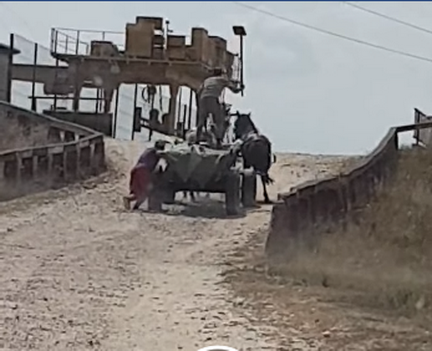 Un bărbat a fost filmat cum își schingiuiește animele. El își lovește cu lopata caii care nu mai puteau trage căruța, plină cu materiale grele, într-o pantă.