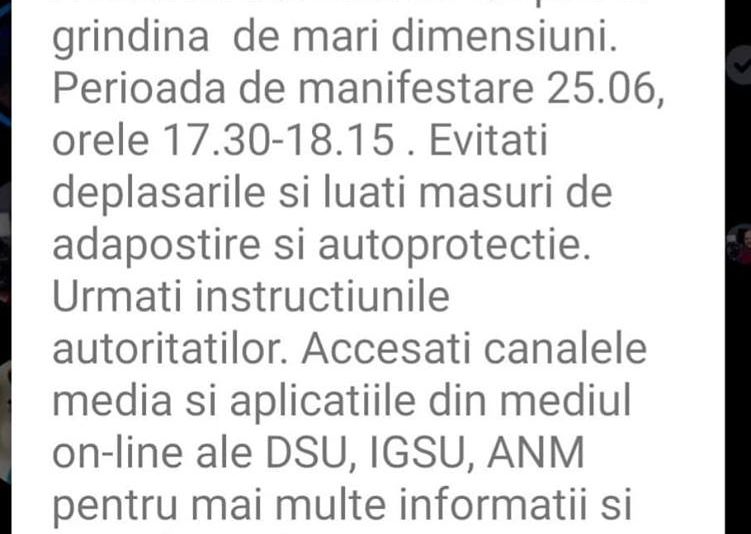 ISU Dâmbovița a transmis astăzi un mesaj prin aplicația Ro-Alert privind avertizarea COD Portocaliu. Atenționarea era menită să îi atenționeze pe dâmbovițenii din mai multe localități să se ferească din calea furtunilor, în intervalul orar 17.30-18.15.
