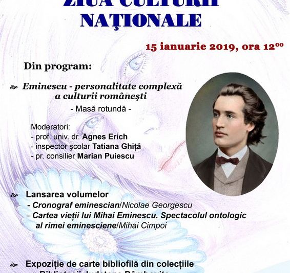 Marţi, 15 ianuarie 2019, orele 12.00, Biblioteca Judeţeană „I. H. Rădulescu” Dâmboviţa, în parteneriat cu Arhiepiscopia Târgoviştei, Inspectoratul Şcolar Judeţean Dâmboviţa şi Societatea Scriitorilor Târgovişteni, organizează Ziua Culturii Naţionale.Programul va include dezbaterea cu tema Eminescu – personalitate complexă a culturii româneşti, lansarea volumelor: Cronograf eminescian/Nicolae Georgescu, Cartea vieţii lui Mihai Eminescu. Spectacolul ontologic al rimei eminesciene/ Mihai Cimpoi şi vernisarea expoziţiei de carte bibliofilă din colecţiile Bibliotecii Judeţene Dâmboviţa.