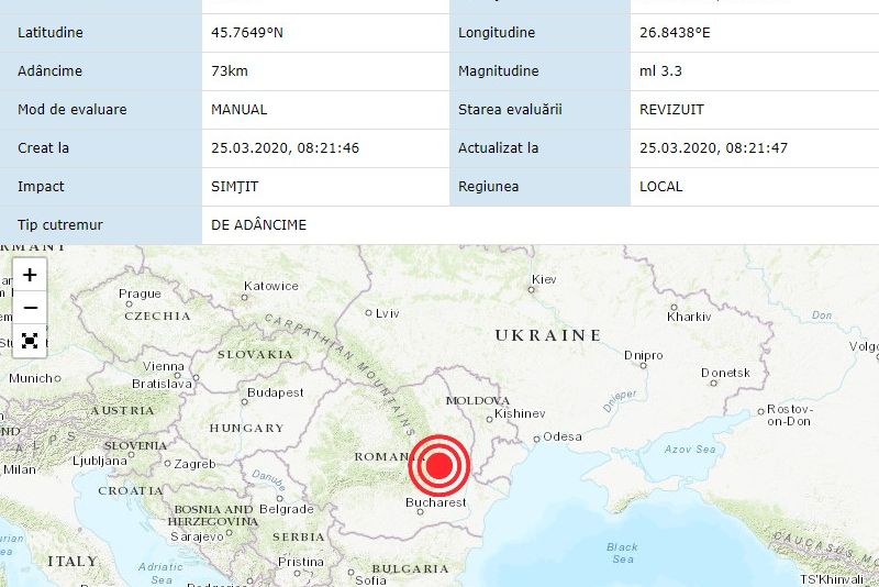 În ziua de 25 Martie 2020 la ora 07:43:37 (ora locală a României) s-a produs în ZONA SEISMICA VRANCEA, VRANCEA un cutremur slab cu magnitudinea ml 3.3, la adâncimea de 73km.