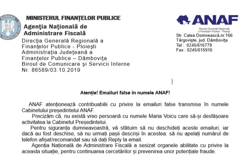 "ANAF atenționează contribuabilii cu privire la emailuri false transmise în numele Cabinetului președintelui ANAF. Precizăm că, nu există vreo persoană cu numele Maria Voicu care să-și desfășoare activitatea la Cabinetul Președintelui.