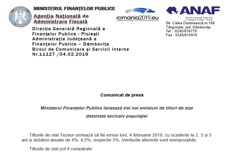 Direcțiile regionale ale ANAF au comunicat acțiunea Guvernului, ce a lansat trei noi emisiuni de titluri de tezaur. Practic, statul, prin MFP, încearcă să se împrumute la populație, oferind o dobândă între 4% și 5%. Scadența este cuprinsă între doi și cinci ani, pentru noile titluri de tezaur emise. Iată condițiile, așa cum au fost ele anunțate de Direcția Generală a Finanțelor Publice Ploiești, Administrația Județeană a Finanțeleor Publice Dâmbovița: