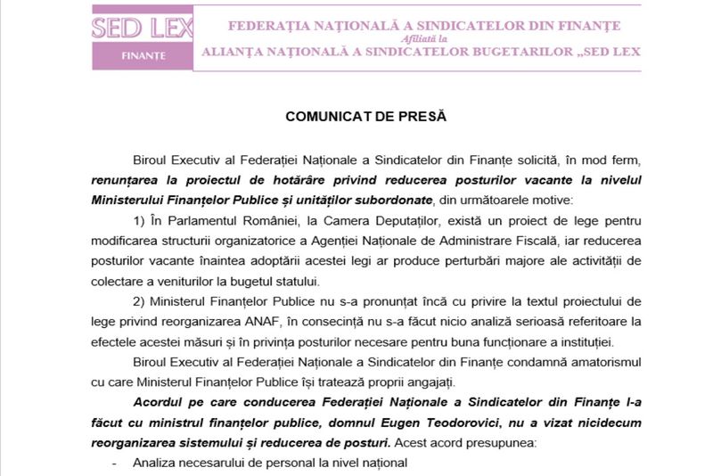 "Biroul Executiv al Federației Naționale a Sindicatelor din Finanțe solicită, în mod ferm, renunțarea la proiectul de hotărâre privind reducerea posturilor vacante la nivelul Ministerului Finanțelor Publice și unităților subordonate, pentru că,în Parlamentul României, la Camera Deputaților, există un proiect de lege pentru modificarea structurii organizatorice a Agenției Naționale de Administrare Fiscală, iar reducerea posturilor vacante înaintea adoptării acestei legi ar produce perturbări majore ale activității de colectare a veniturilor la bugetul statului."(...)