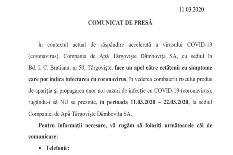 COMUNICAT DE PRESĂ În contextul actual de răspândire accelerată a virusului COVID-19(coronavirus), Compania de Apă Târgovişte Dâmboviţa SA, cu sediul în Bd. I. C. Bratianu, nr.50, Târgovişte, face un apel către cetăţenii cu simptome care pot indica infectarea cu coronavirus, în vederea combaterii riscului produs de apariţia şi propagarea unor noi cazuri de infecţie cu COVID-19 (coronavirus), rugându-i să NU se prezinte, în perioada 11.03.2020 – 22.03.2020, la sediul Companiei de Apă Târgovişte Dâmboviţa SA.Pentru informaţii necesare, vă rugăm să folosiţi următoarele căi decomunicare: Telefonic:- 0800800168 (gratuit)- 0245/631824- 0245/614403Prin e-mail:- [email protected]Site-ul oficial www.catd.ro;