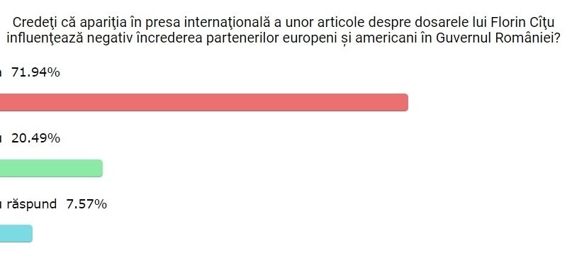 La întrebarea „Credeţi că apariţia în presa internaţională a unor articole despre dosarele lui Florin Cîţu influenţează negativ încrederea partenerilor europeni şi americani în Guvernul României?”, majoritatea au răspuns afirmativ.