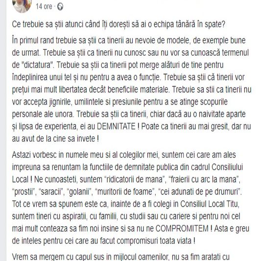 <<Astazi vorbesc in numele meu si al colegilor mei, suntem cei care am ales impreuna sa renuntam la functiile de demnitate publica din cadrul Consiliului Local ! Ne cunoasteti, suntem “ridicatorii de mana”, “fraierii cu arc la mana”, “prostii”, “saracii”, “golanii”, “muritorii de foame”, “cei adunati de pe drumuri”. Tot ce vrem sa spunem este ca, inainte de a fi colegi in Consiliul Local Titu, suntem tineri cu aspiratii, cu familii, cu studii sau cu cariere si pentru noi cel mai mult conteaza sa fim noi insine si sa nu ne COMPROMITEM ! Asta e greu de inteles pentru cei care au facut compromisuri toata viata !