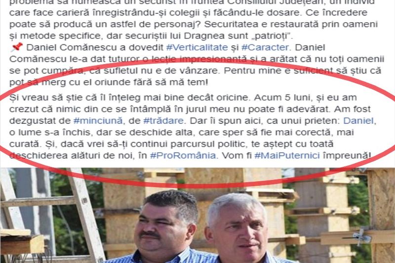 Și vreau să știe că îl înțeleg mai bine decât oricine. Acum 5 luni, și eu am crezut că nimic din ce se întâmplă în jurul meu nu poate fi adevărat. Am fost dezgustat de #minciună, de #trădare. Dar îi spun aici, ca unui prieten: Daniel, o lume s-a închis, dar se deschide alta, care sper să fie mai corectă, mai curată. Și, dacă vrei să-ți continui parcursul politic, te aștept cu toată deschiderea alături de noi, în #ProRomânia. Vom fi #MaiPuternici împreună!"