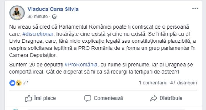 "Nu vreau să cred că Parlamentul României poate fi confiscat de o persoană care, #discreționar, hotărăște cine există și cine nu există. Se întâmplă cu dl Liviu Dragnea, care, fără nicio explicație legală sau constituțională plauzibilă, a respins solicitarea legitimă a PRO România de a forma un grup parlamentar în Camera Deputaților.
