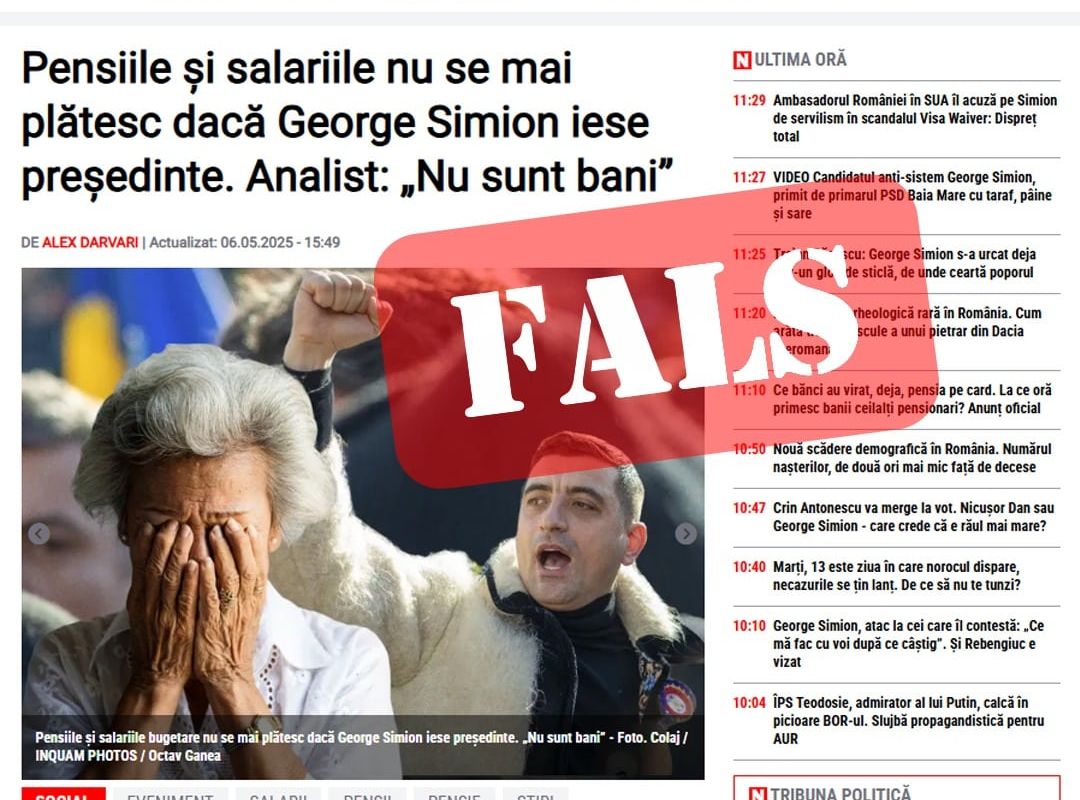 Articolul cu titlul alarmist "Pensiile și salariile nu se mai plătesc dacă George Simion iese președinte. Analist: Nu sunt bani" a fost publicat pe data de 6 mai 2025 și a stârnit imediat reacții puternice din partea AUR și a susținătorilor candidatului. În replică, echipa de campanie a lui George Simion a emis un comunicat ferm de dezminţire: "Adevărul: Pensiile nu se taie! Să fie clar pentru toată lumea: Drepturile pensionarilor vor fi respectate, punct!"