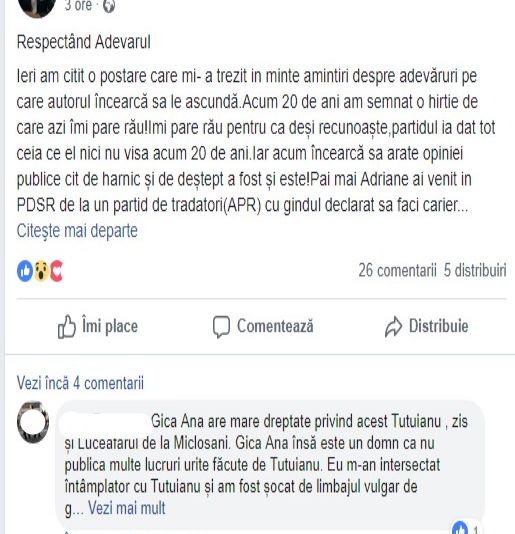 Ieri am citit o postare care mi- a trezit in minte amintiri despre adevăruri pe care autorul încearcă sa le ascundă.Acum 20 de ani am semnat o hirtie de care azi îmi pare rău!Imi pare rău pentru ca deși recunoaște,partidul ia dat tot ceia ce el nici nu visa acum 20 de ani.Iar acum încearcă sa arate opiniei publice cit de harnic și de deștept a fost și este!Pai mai Adriane ai venit in PDSR de la un partid de tradatori(APR) cu gindul declarat sa faci cariera politica și astăzi esti unde îți este locul!