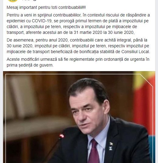 Pentru a veni in sprijinul contribuabililor, în contextul riscului de răspândire a epidemiei cu COVID-19, se prorogă primul termen de plată a impozitului pe clădiri, a impozitului pe teren, respectiv a impozitului pe mijloacele de transport, aferente acestui an de la 31 martie 2020 la 30 iunie 2020,