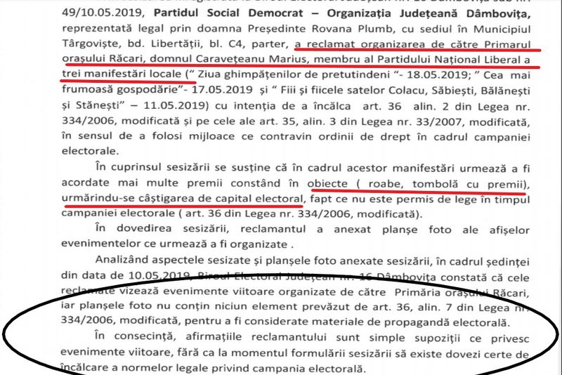 Există și multe plângeri considerate neîntemeiate. PSD Dâmbovița a reclamat că Primăria Răcari, condusă de primarul liberal Marius Caravețeanu, încearcă să distribuie materiale interzis a fi folosite în campania electorală, cu prilejul unor evenimente organizate de administrația locală.
