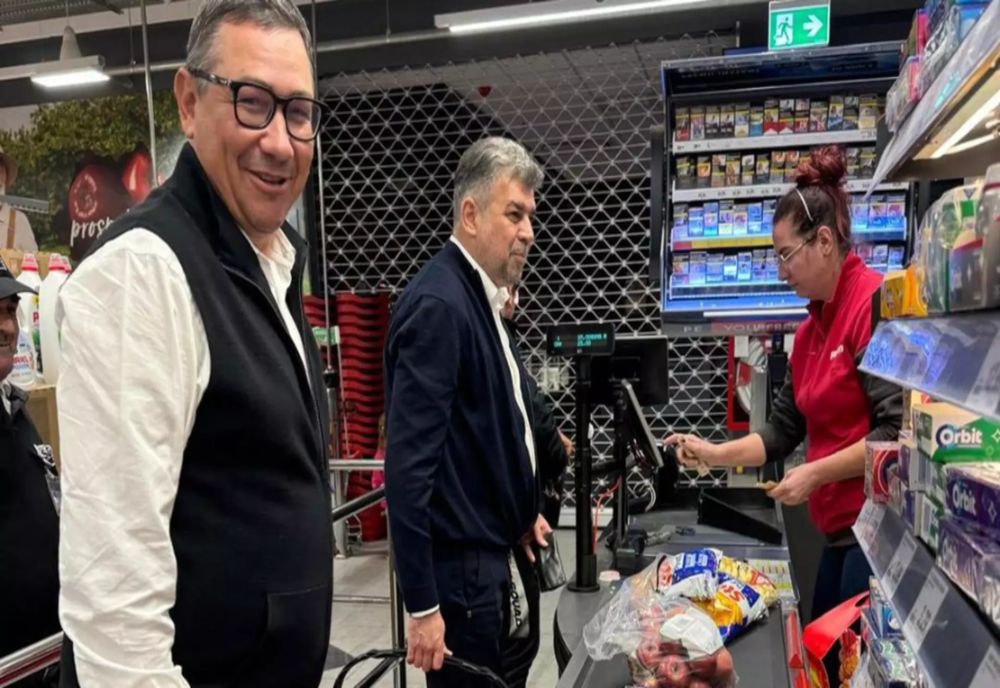 Marcel Ciolacu și Victor Ponta au fost la cumpărături într-un magazin din Dâmbovița după o deplasare electorală. Cei doi politicieni și-au cumpărat pufuleți, ciocolată, dar și câteva mere, și au spus că sunt provizii pentru a viziona meciul.