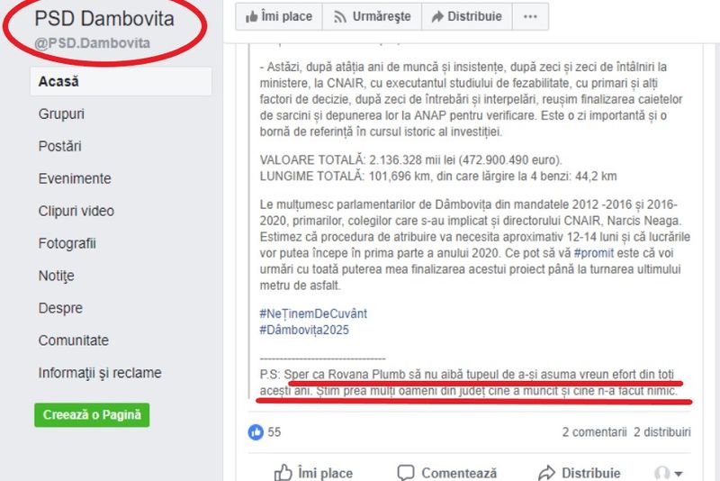 Fosta pagină oficială a PSD Dâmbovița, între timp rebrenduită cu fotografia lui Adrian Țuțuianu, după ce acesta a pierdut susținerea partidului, iar interimar, la conducerea PSD Dâmbovița, a fost numită Rovana Plumb, o atacă pe aceasta din urmă în cea mai recentă postare. Concret, se vorbește despre reabilitarea DN 71: