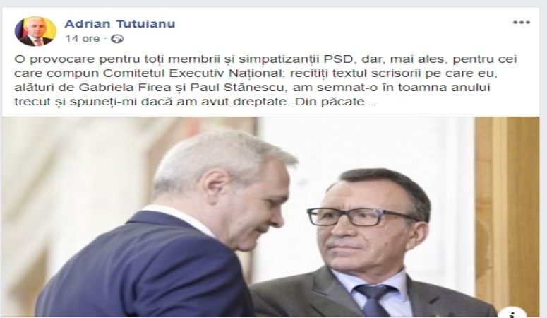 "O provocare pentru toți membrii și simpatizanții PSD, dar, mai ales, pentru cei care compun Comitetul Executiv Național: recitiți textul scrisorii pe care eu, alături de Gabriela Firea și Paul Stănescu, am semnat-o în toamna anului trecut și spuneți-mi dacă am avut dreptate. Din păcate..."
