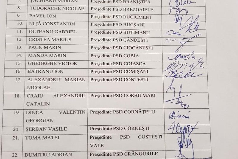 În Dâmbovița, aproape toți membrii BPJ al PSD au semnat deja (foto exemplu), în data de 06.11.2018, o scrisoare în care arată că îl susțin pe Adrian Țuțuianu și că nu recunosc președintele interimar trimis de la centru, Rovana Plumb.