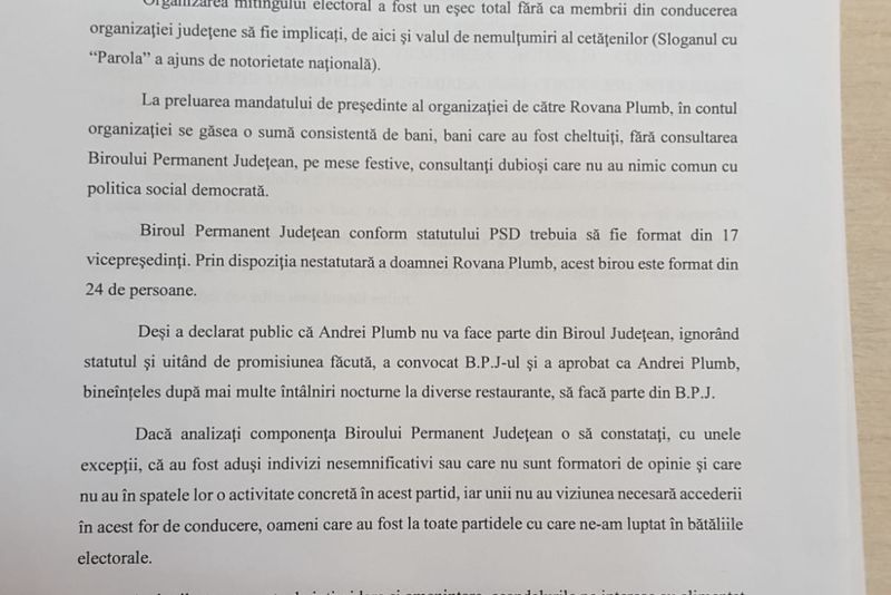 Scrisoarea arată că Rovana Plumb nu ar respecta statutul partidului privind numărul de membri ai Biroului Permanent Județean și l-ar fi impus pe fiul său, Andrei, ca membru al acestei structuri de conducere.