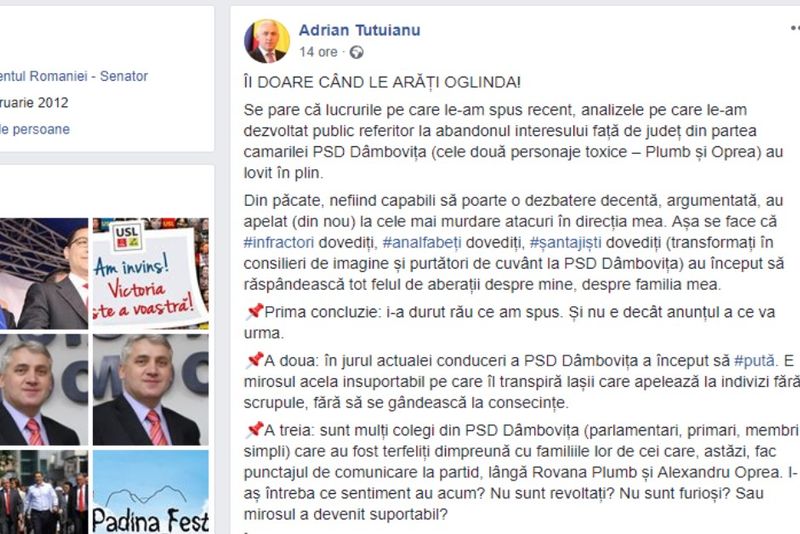 Senatorul independent Adrian Țuțuianu a continuat seria atacurilor la adresa conducerii PSD Dâmbovița, prin postări pe pagina personală de facebook. Cele mai recente postări sunt însă de o virulență deosebită, conținând acuze grave la adresa foștilor săi colegi social-democrați.
