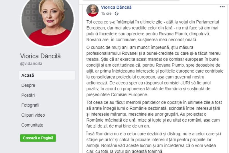 Viorica Dăncilă a avut o primă reacție (28 septembrie), pe pagina personală de facebook, după ce comisia JURI a Parlamentului European a dat un vot negativ reprezentantului României, Rovana Plumb, nominalizat pentru postul de comisar european ( la transporturi). Reprezentanții Comisiei Juridice au reacționat, prin votul dat, față de neconcordanțele din declarațiile de avere ale Rovanei Plumb, europarlamentar și președinte al PSD Dâmbovița.