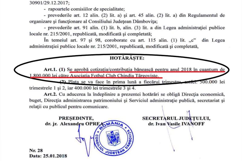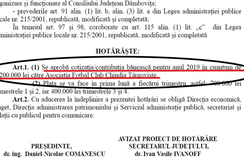 Echipa de fotbal Chindia Târgoviște va avea parte de un buget majorat și în 2019. Asociații principali, Consiliul Județean Dâmbovița și Primăria Târgoviște, au mărit, și în 2019, alocările bugetare către echipă. Este al patrulea an consecutiv când bugetul se mărește.