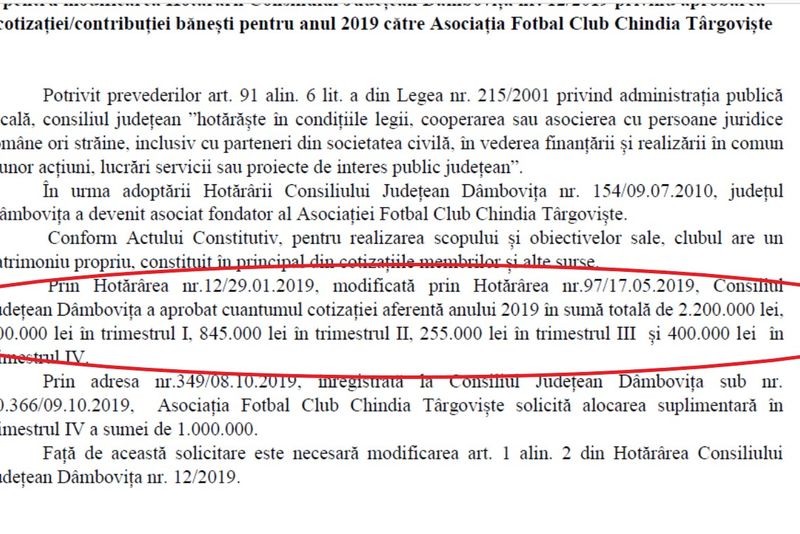Majorarea a fost făcută în urma unei solicitări făcute de prezentanții clubului de fotbal înregistrată la CJ Dâmbovița în data de 8 octombrie 2019.