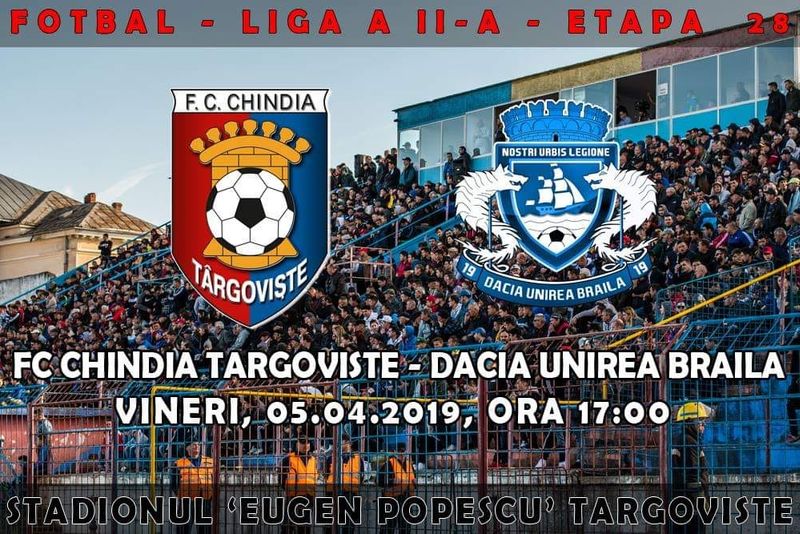 Astăzi, de la ora 17.00, în primul meci al etapei a 28-a a Ligii a II-a, Chindia Târgoviște, echipă aflată pe locul al patrulea, primește vizita Daciei Unirea, locul 20. Chindia se află la doar 2 puncte distanţă de locul al doilea, deţinut în acest moment de Sportul Snagov.Ambele combatante îşi doresc cu ardoare cele 3 puncte puse în joc, formaţia gazdă pentru a se menţine în lupta pentru accederea în primul eşalon, gruparea pregătită de Florentin Petre, pentru a aduna puncte vitale în tentativa sa de a se salva de la retrogradare.