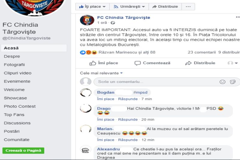 Foto- pagină facebook FC Chindia Târgoviște, reacții suporteri,