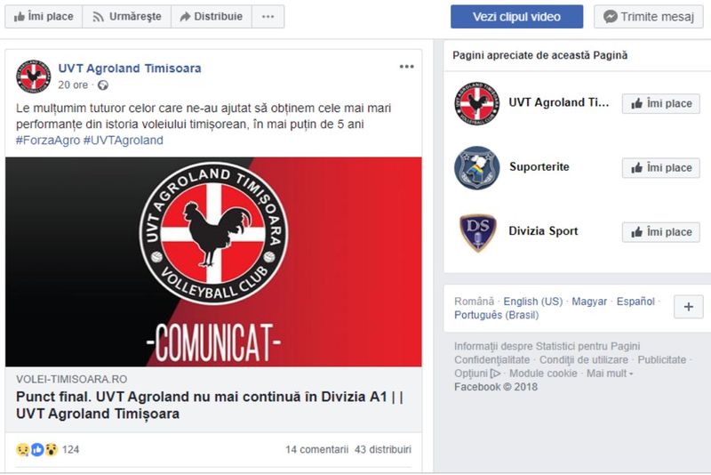 Comunicatul celor de la UVT Agroland Timișoara, postat și pe propria pagină de socializare a clubului (foto-captură pagină facebook) nu lasă loc de dubii. Campionatul feminin de volei, divizia A1, aflat momentan în pauza de iarnă, va continua doar cu opt echipe, cel mai mic număr de competitoare din ultimii 50 de ani.