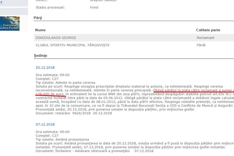 "Admite în parte cererea principală. Obligă pârâtul (n.r. CSM Târgoviște) la plata către reclamant( n.r. george dikeolakos) a sumei de 178.000 de euro, în echivalent lei la cursul BNR din ziua plății, reprezentând despăgubiri stabilite potrivit art.XIV lit.c din contractul încheiat între părţi la data de 05.06.2012. Obligă pârâtul la plata către reclamantă a dobânzii legale calculată pentru această sumă, începând cu data de 08.01.2013, până la data plății efective."