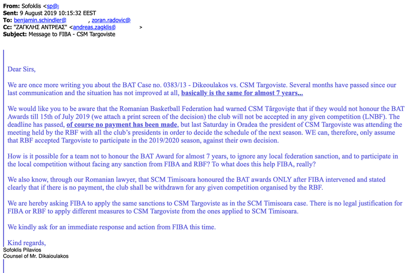 Grecul George Dikeolakos este reprezentat în relația cu FIBA (Federația Internațională de Baschet) de avocatul Sofoklis Pilavios, fost președinte al federației Elene de Fotbal, și actualmente arbitru la tribunalul de Arbitraj Sportiv de la Laussane. Acesta a cerut (vezi foto document), secretarului general al FIBA, grecul Andreas Zalgklis, ca, în cazul CSM Târgoviște, FIBA să facă presiuni asupra FRB, pentru a exclude din competiții CSM Târgoviște, ca urmare a neachitării datoriei către Dikeolakis și Matic (fostă jucătoare la CSM Târgoviște).