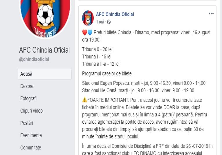 Cei de la Chindia Târgoviște au făcut anunțul oficial în privința măsurilor luate împotriva galeriei celor de la Dinamo, chiar astăzi (12 august 2019) cu patru zile înainte de confruntarea cu Dinamo, din etapa a VI-a a Ligii întâi de fotbal.