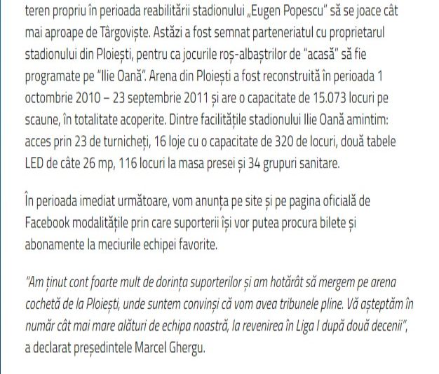 Printr-un comunicat de presă, președintele celor de la Chindia Târgoviște, Marcel Ghergu (foto) a anunțat că a fost perfectat un acord cu autoritățile din Ploiești, iar Chindia va juca pe stadionul "Ilie Oană", meciurile de acasă, din liga I de fotbal. Petrolul Ploiești, echipa ce dispută meciurile de acasă pe acest stadion, a fost una dintre principalele contracandidate, ale celor la Chindia, la promovarea în prima ligă, în acest sezon.