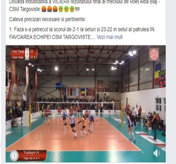 Partida dintre campiona en-titre din voleiul feminin românesc, Volei Alba Blaj, și CSM Târgoviște, a avut loc miercuri, 26 februarie, pe terenul ardelencelor și s-a încheiat cu victoria gazdelor, la capătul unui meci de cinci seturi, în care oaspetele ar fi putut câștiga. CSM Târgoviște a avut 2-1 la seturi și 23-22 în setul patru, moment în care, la o minge ce a lovit tija fileului, arbitrii au acordat punct gazdelor. A fost viciere de rezultat, pentru că punctul ar fi trebuit sa fie al CSM Târgoviște, mingea lovind mâna unei jucătoare a gazdelor, înainte să lovească tija fileului, spune Gabriel Boriga, într-o postare pe pagina personală de facebook: