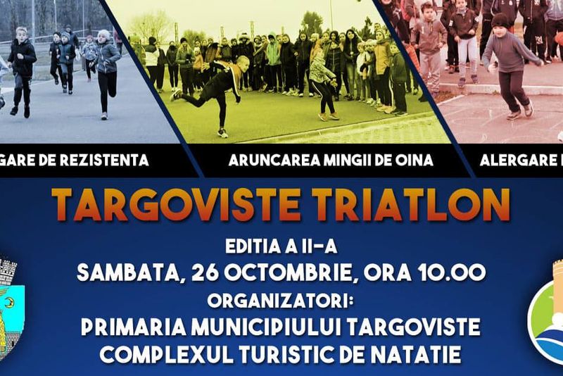 Târgoviște Triatlon, competiția celor puternici, revine la Complexul Turistic de Natație printr-o super ediție. Sâmbătă, 26 octombrie, îți poți testa limitele sportive bifând trei probe de foc: alergare de viteză (50 m), aruncarea mingii de oină și alergare de rezistență (600-1.200 m).Nu există limite de vârstă, iar toți participanții vor fi premiați de organizatori, Primăria Municipiului Târgoviște și Complexul Turistic de Natație. Vom avea ca parteneri antrenori specializați, care își desfășoară activitatea la nivelul cluburilor târgoviștene, cu sportivi medaliați la competițiile naționale.Concurenții se pot înscrie în ziua evenimentului, începând cu ora 09.00, sau lăsând un mesaj în continuarea acestei postări, care să cuprindă numele, prenumele și ID-ul probei. Pentru a puncta în clasamentul general, este obligatorie participarea la toate probele.